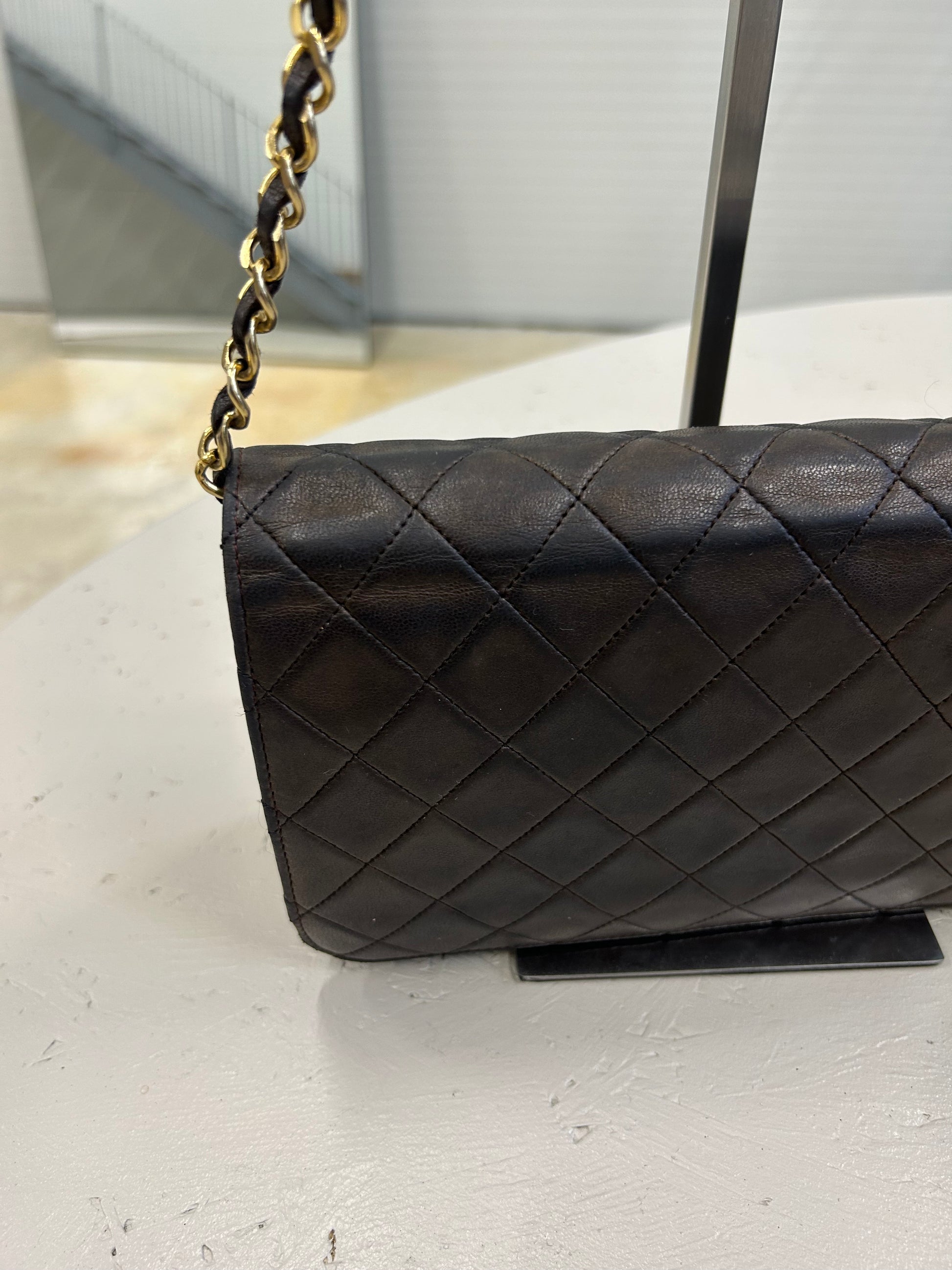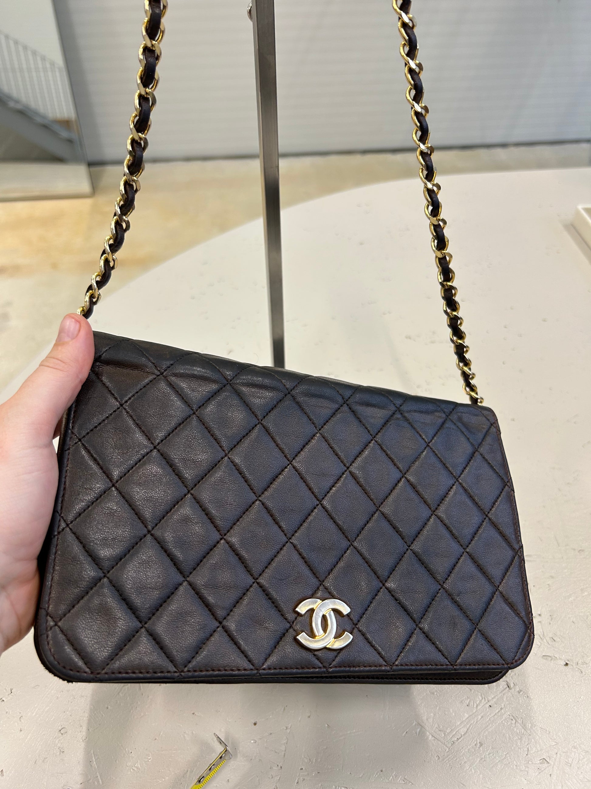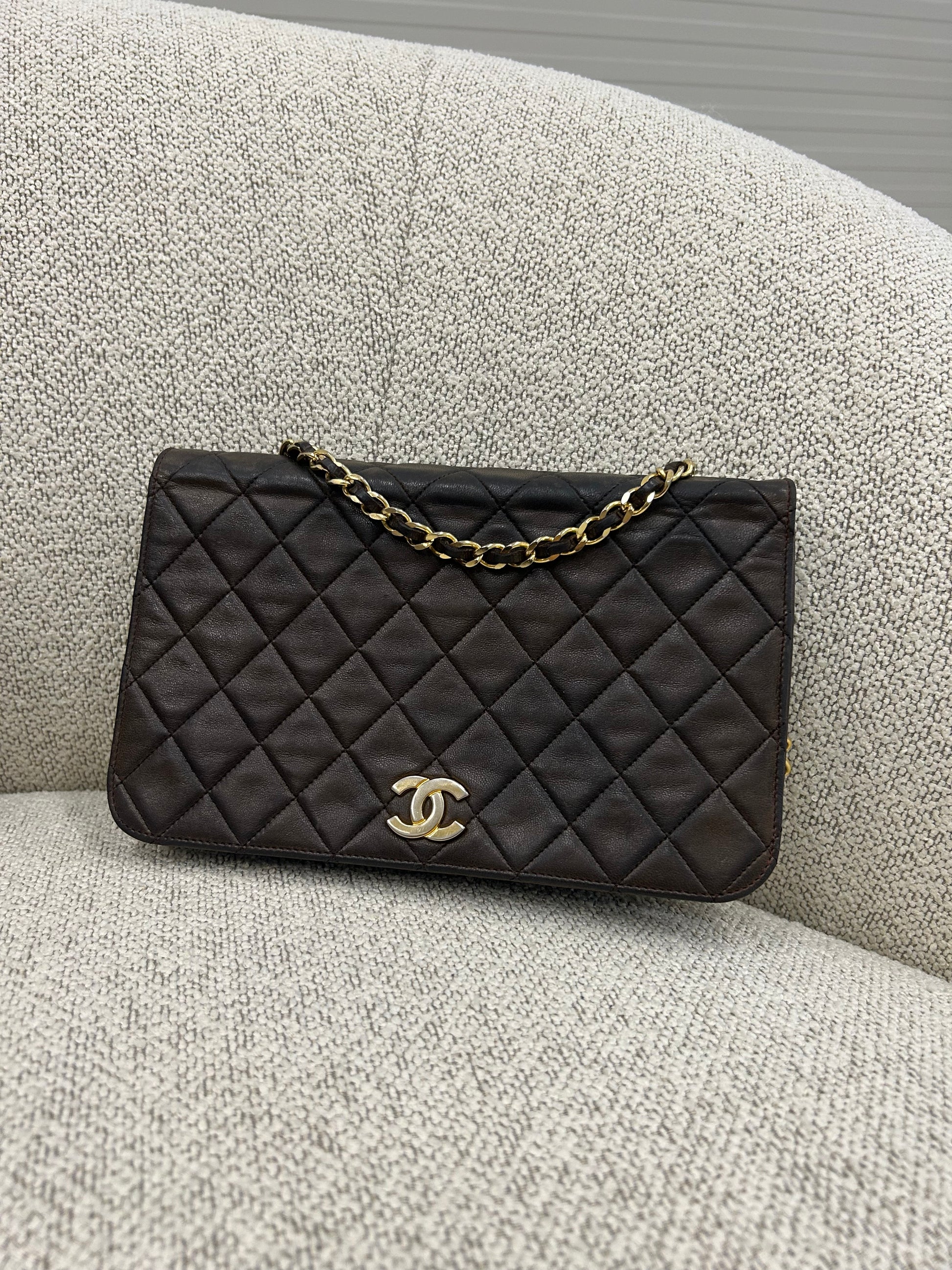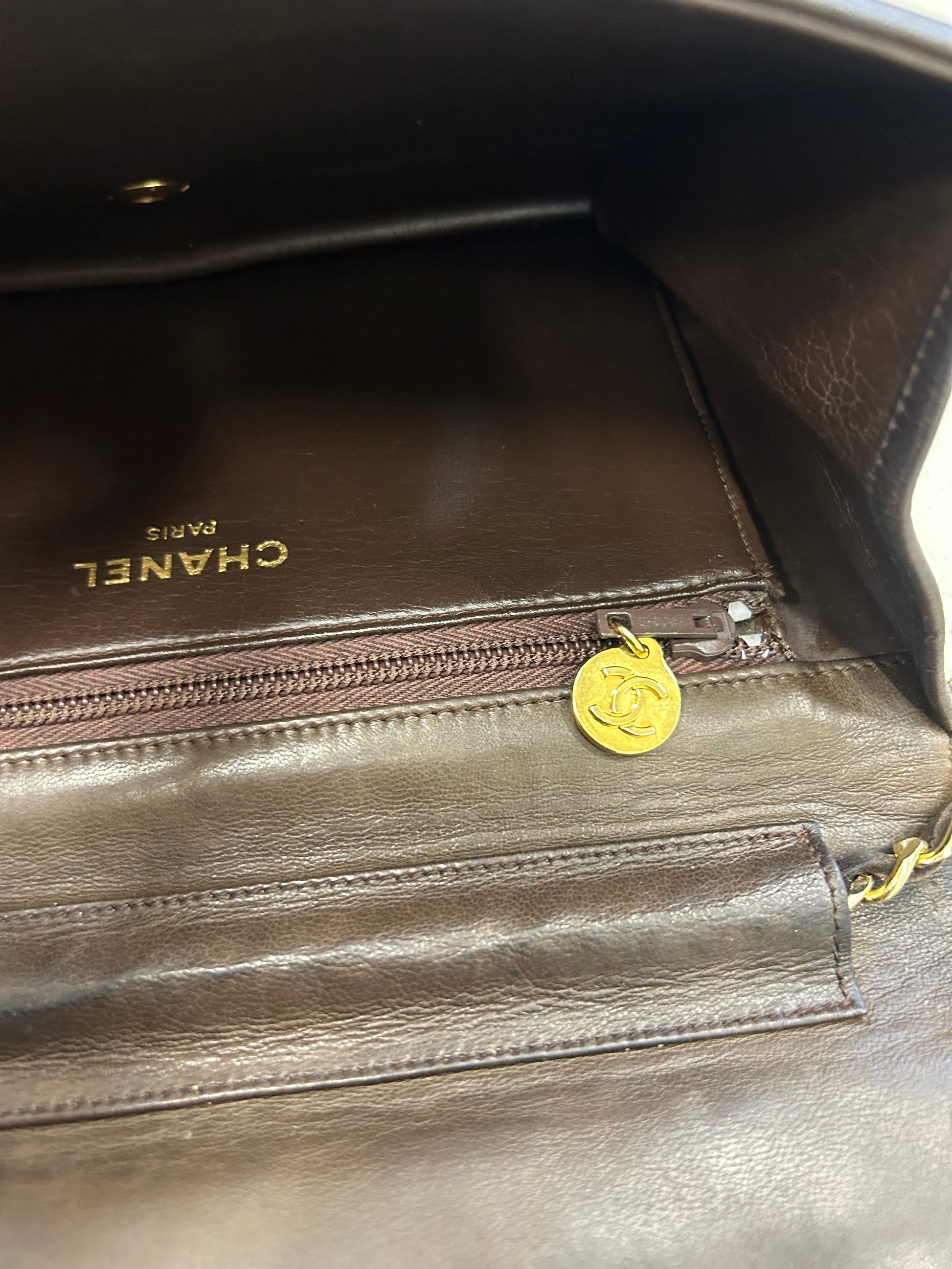 Flot Chanel full flap taske i mørkebrunt lammeskind.