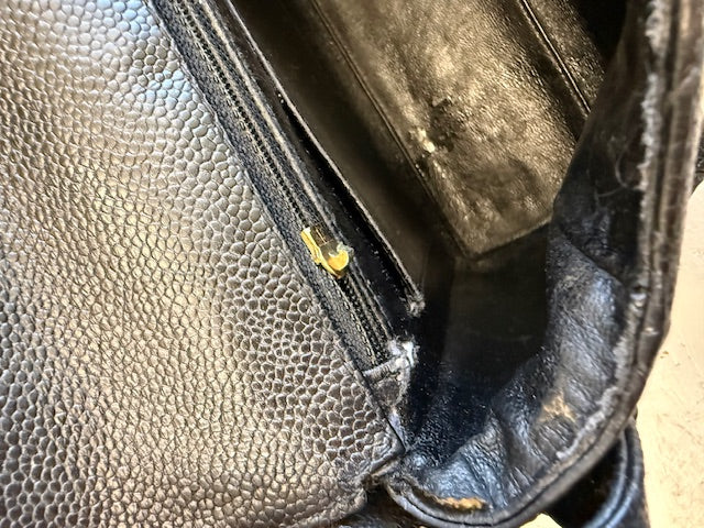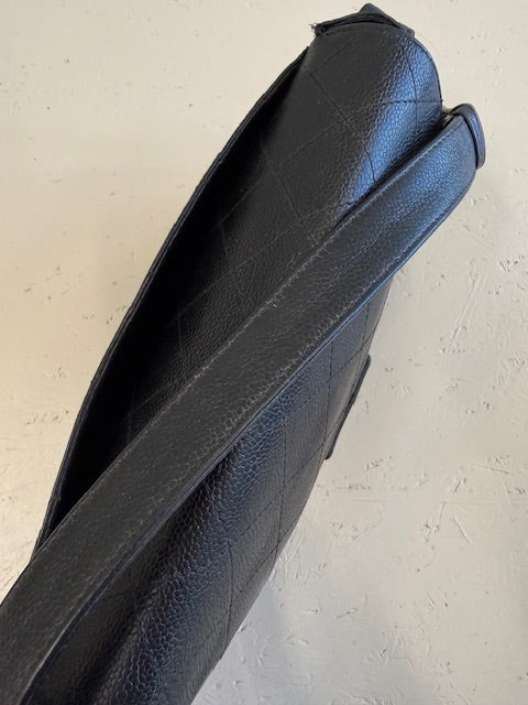 Denne elegante Chanel Shoulder Bag er et klassisk vintagefund, udført i det eftertragtede sorte Caviar-læder med struktur og det ikoniske indsyede CC-logo på fronten. Den tidløse silhuet og alsidige størrelse gør den perfekt til både hverdag og særlige anledninger – et sofistikeret og luksuriøst statement i enhver garderobe.