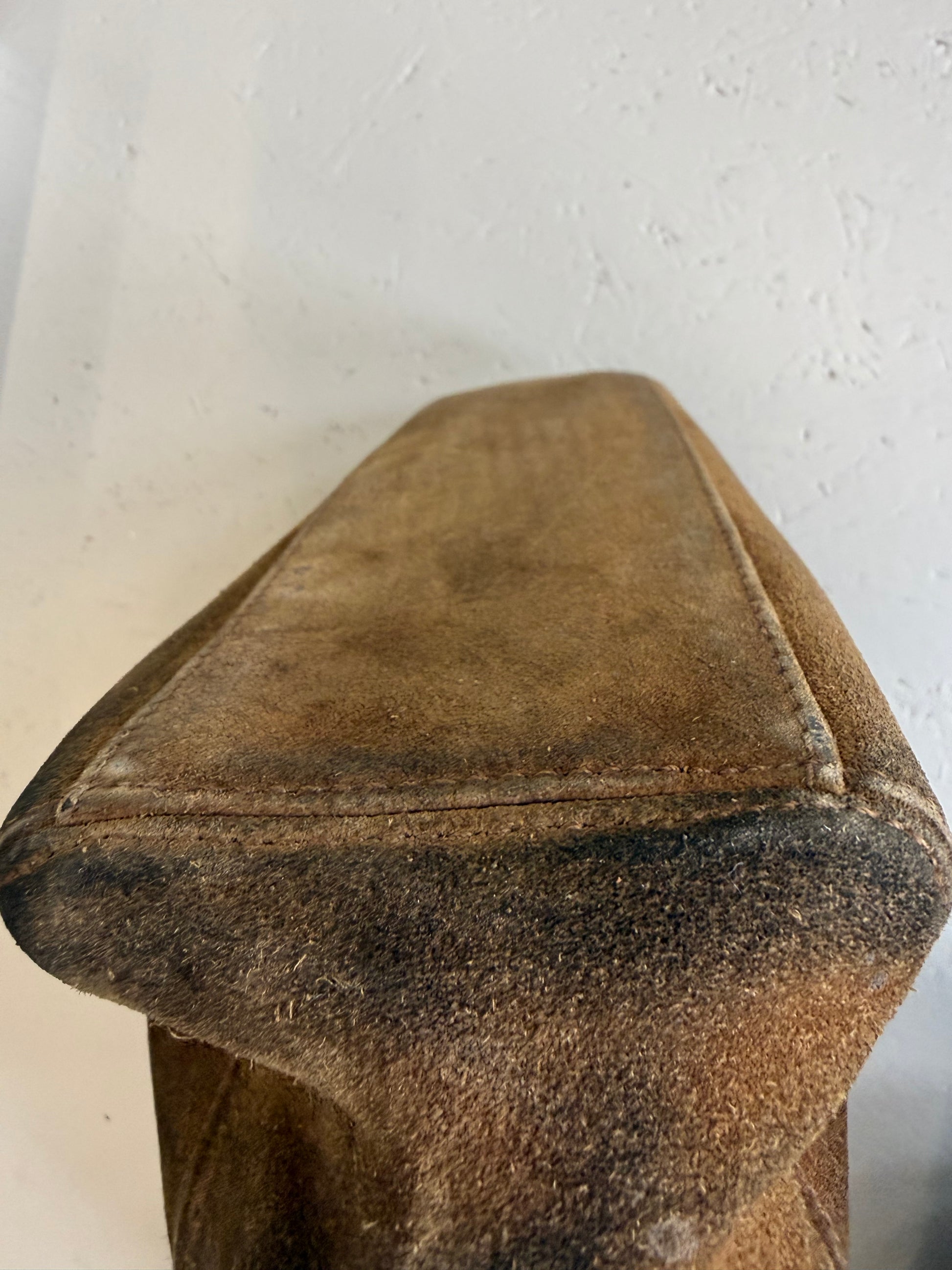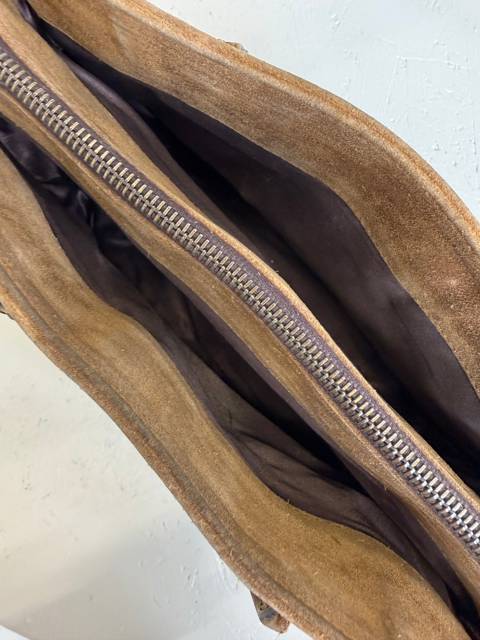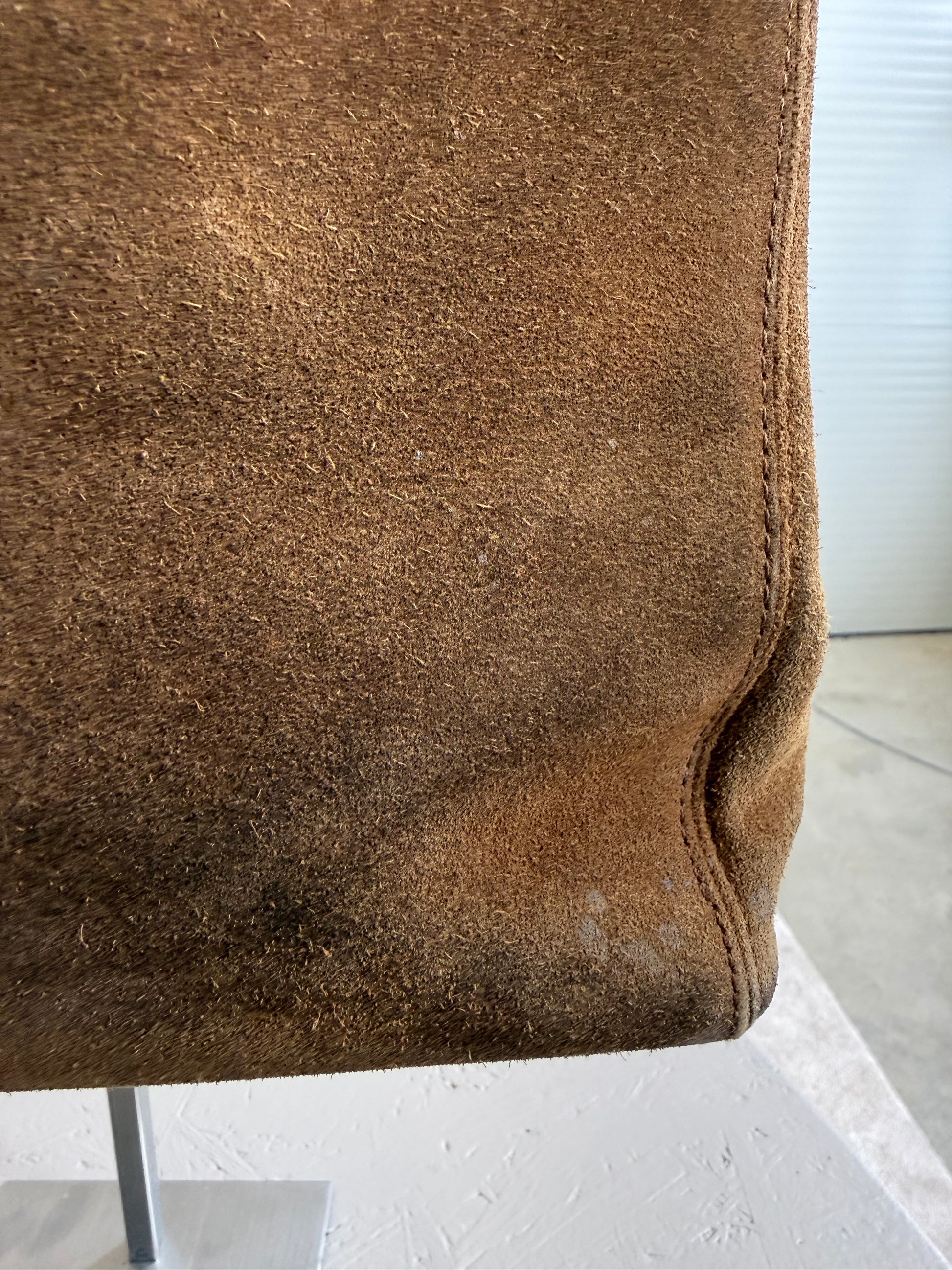 Tasken fremstår generelt i god stand. Udvendigt ses let patina i ruskindet – et naturligt tegn på alder og brug, men der er ingen huller eller ødelagte områder. Serienummeret er intakt og medfølger som dokumentation for ægtheden.