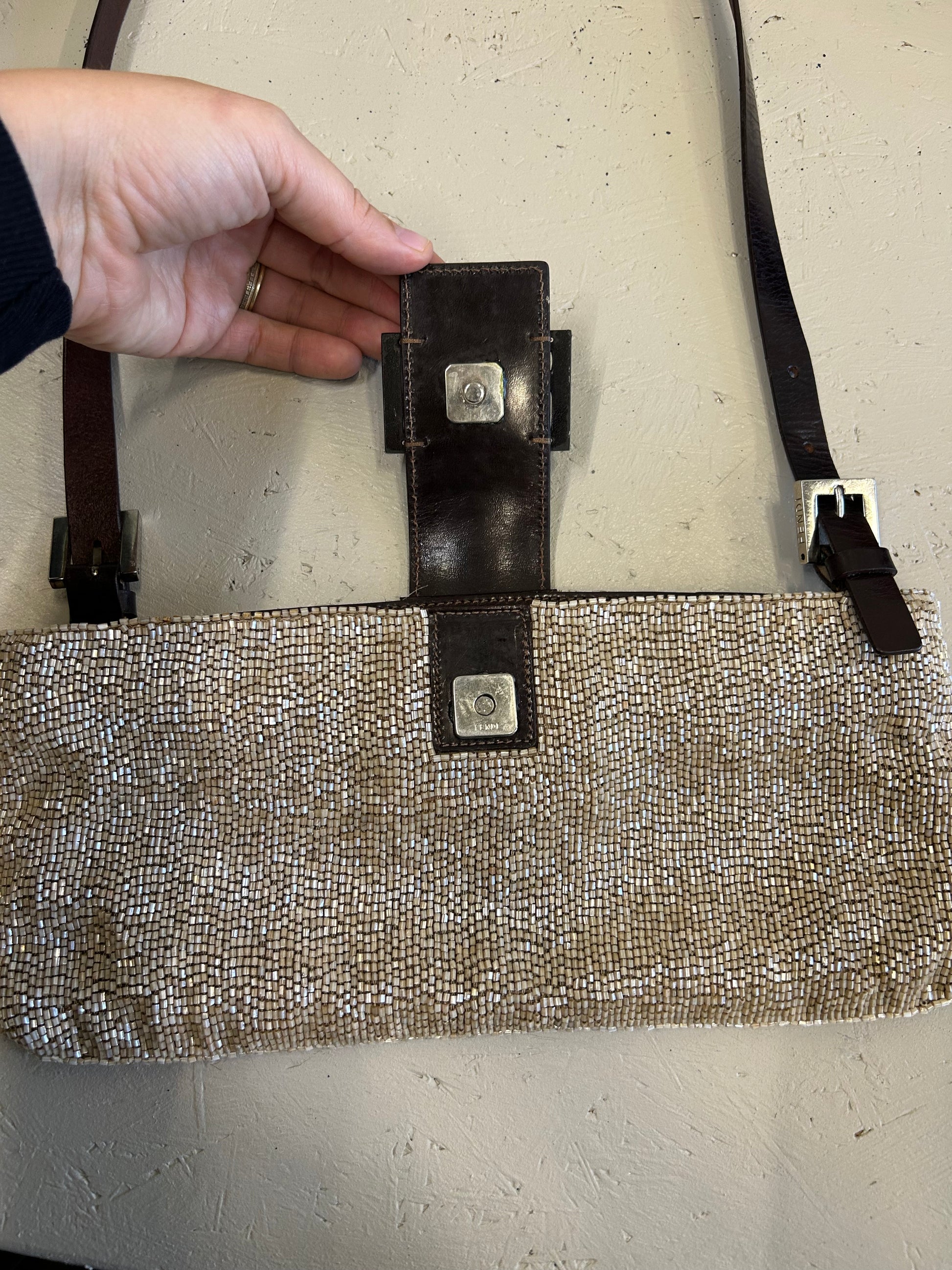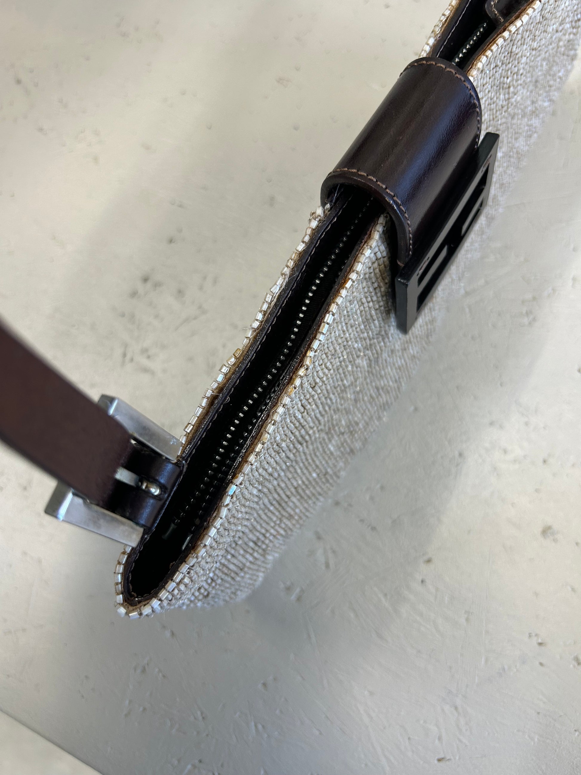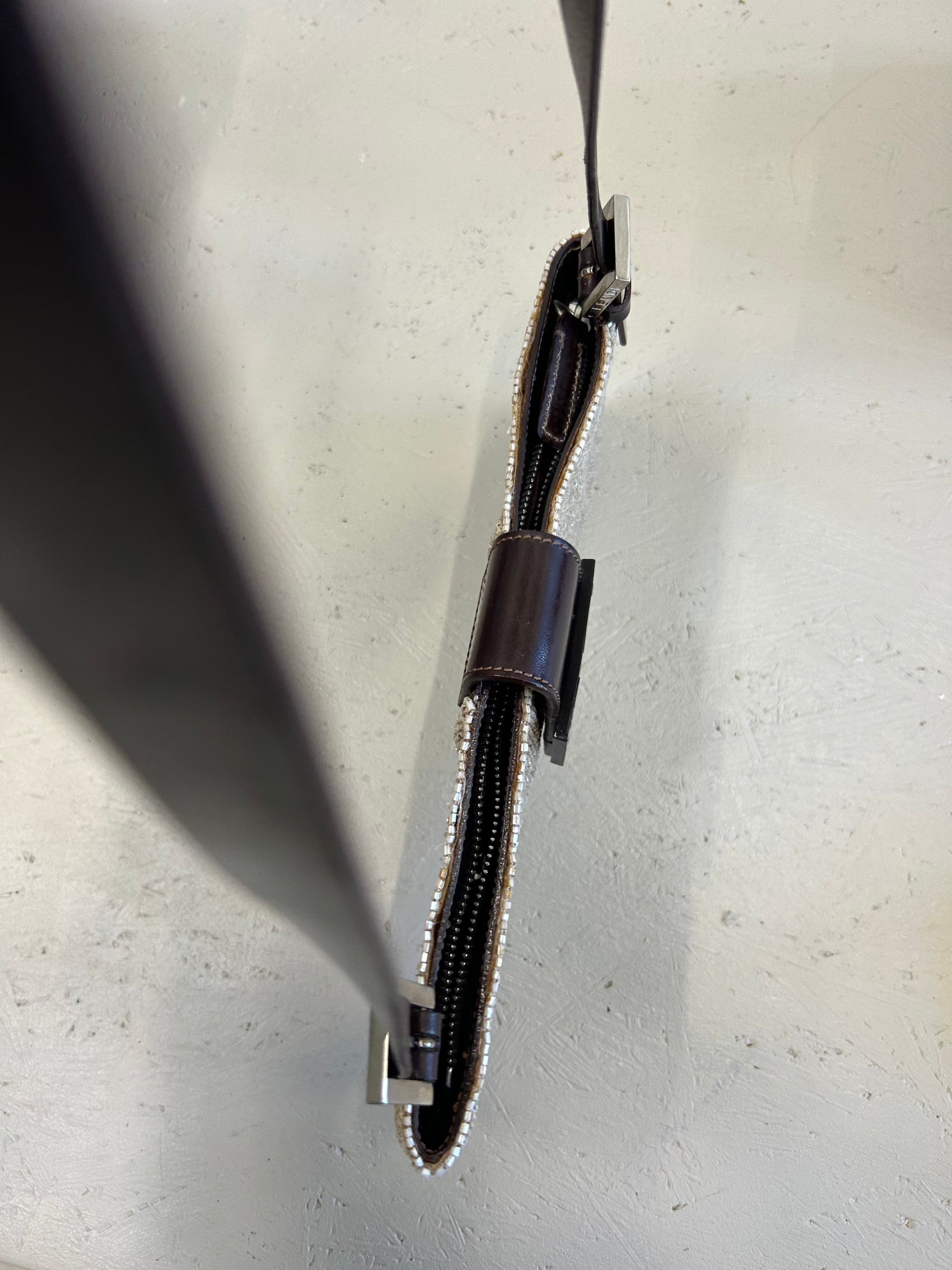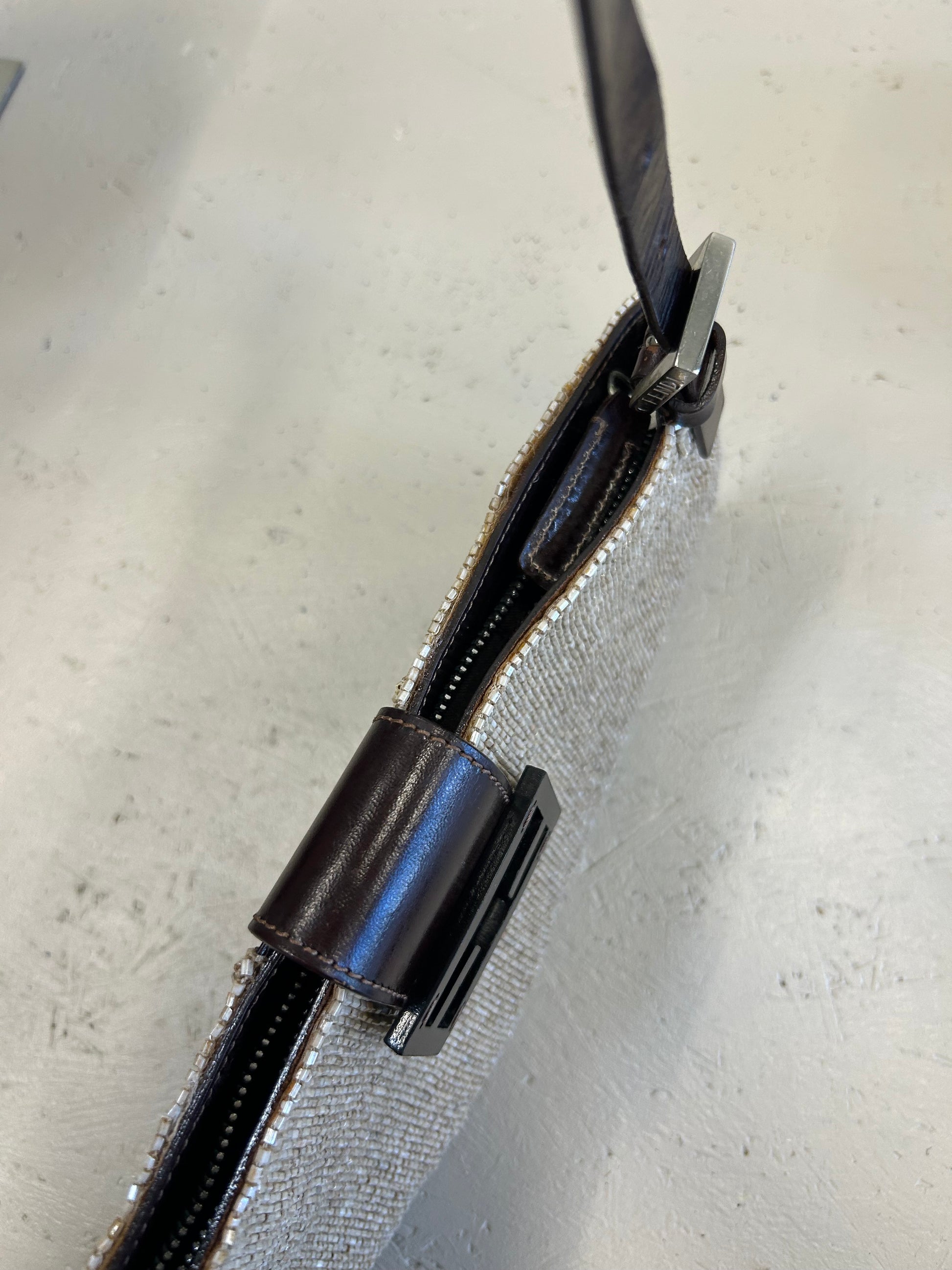 Denne unikke Fendi Baguette er en sjælden perle af en taske – bogstaveligt talt. Udført med smukt perlebroderi i et detaljeret og iøjnefaldende design, er den et ægte statement-piece, som skiller sig ud i gadebilledet. Den ikoniske Baguette-silhuet kombineret med det kunstneriske udtryk gør den til et eftertragtet samlerobjekt og en elegant ledsager til både hverdag og særlige anledninger.
